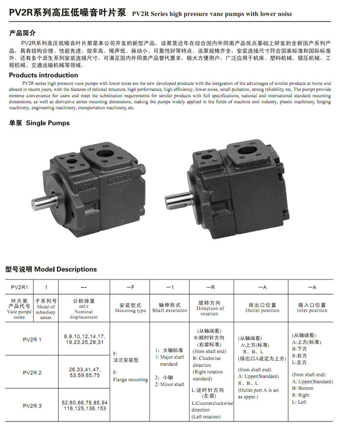 PV2R4系列葉片泵它在結構上采用高次方程曲線的定子,側板和壓力板表面進行磷蒜錳皮膜處理,降低了噪聲,并增加了耐磨性,而且具有體積小、質量小、外形美觀和安裝方便等特點。軸向柱塞泵與聯軸器的配合關系,應為二級間隙配合。特別適用于對環境噪聲控制較嚴的室內機械,如塑料機械、輕工機械、鑄鍛機械、金屬切削機床等,同時也適用于工程機械等領域。轉子、葉片、定子都夾在前后配流中間,當轉子轉動時,葉片受離心力而緊貼定子內表面,起密封作用,將吸排油腔隔開。